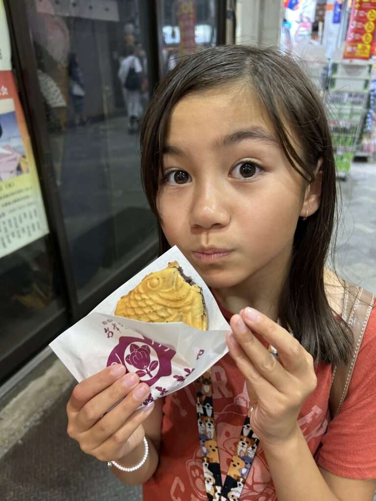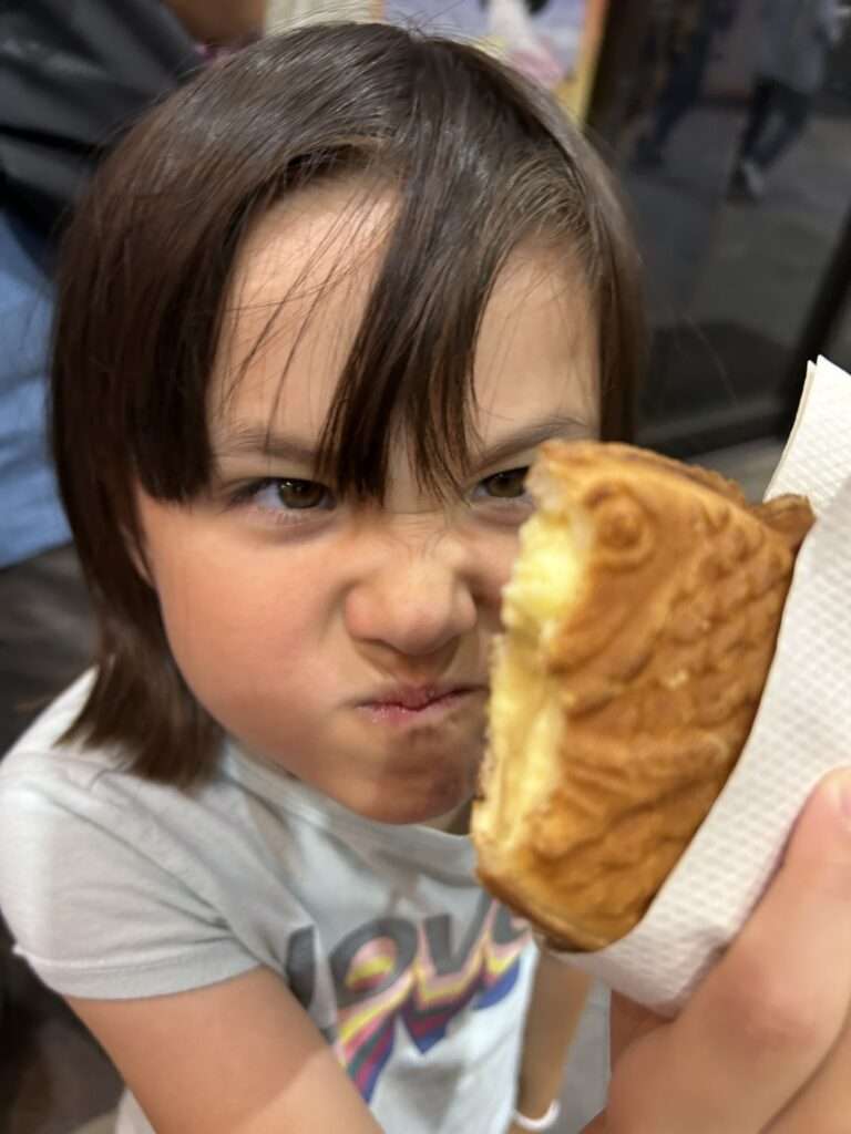 Don’t worry, we saw more animals than that. When we got out of the park we started to hunt for lunch. We quickly found a Chinese restaurant. We went to a game station with lots of claw machines. Then we saw a ramen place we wanted to go to, but it was a 45 minute wait and we DID NOT want to wait for that long. Then we found a ramen place that was super quick. We shared two bowls and knew that it was not enough. Then we went into a market and found our dessert for the night. It’s called Taiyakis. They are waffles filled with different fillings. I had one with sweet bean paste called red bean. My sister had one with custard.
